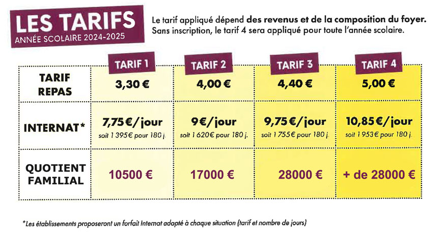 Le prix des repas à la cantine est fixé en fonction des conditions de ressources des familles ou plus exactement du quotient familial. Ce dispositif concerne tous les élèves inscrits dans l'établissement. Le but est de permettre à tous de bénéficier de repas équilibrés.