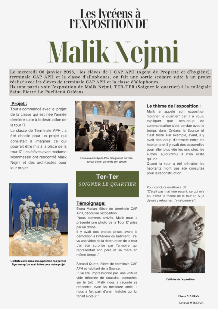 Le mercredi 8 janvier 2025, les élèves de CAP Agent de Propreté et d'Hygiène et d'UPE2A sont allés à la collégiale Saint-Pierre Le Puellier retrouver le photographe Malik Nejmi qui leur a présenté son exposition Ter-Ter soigner le quartier.
